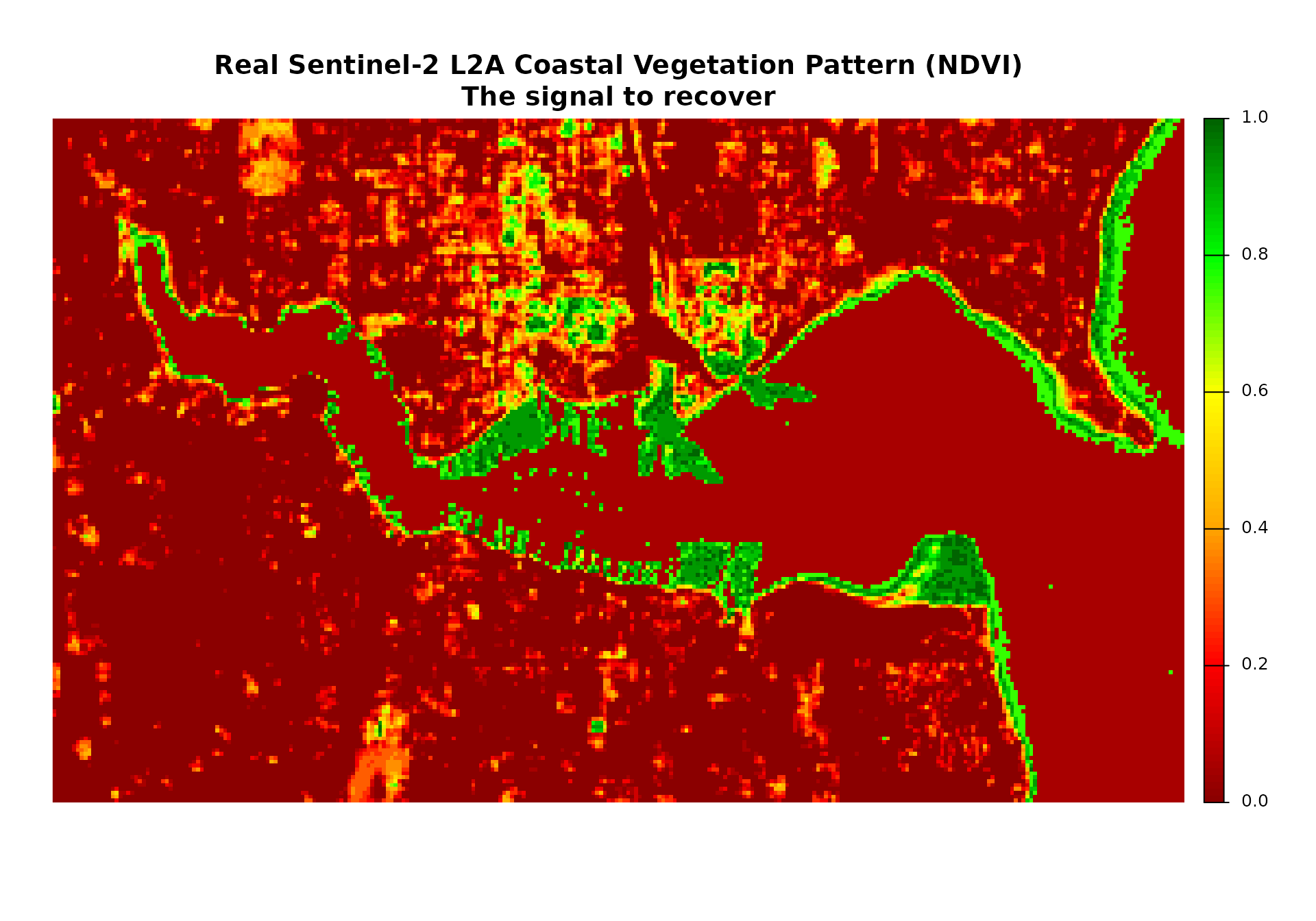 Sentinel-2 L2A NDVI data from Copernicus Hub Ecosystem provides authentic coastal vegetation patterns. NDVI values range from -0.8 (water/bare soil) to 1.6+ (dense vegetation).